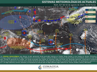 Oaxaca, Oaxaca, Sábado 02 de Agosto, 2025 (Fuente: Comunicado).- La Coordinación Estatal de Protección Civil y Gestión de Riesgos (CEPCyGR) informa que, un canal de baja presión, una baja superior sobre Guatemala y la onda tropical número 19; seguirán incentivando procesos de lluvias de intensidad variable en mayor parte del estado.