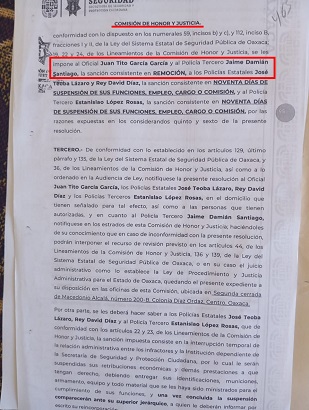 Por la trascendencia de los hechos, el caso fue turnado a la Comisión de Honor y Justicia de la Policía Estatal quién determinó a finales del año pasado que dos implicados, el oficial Juan Tito García y el policía tercero Jaime Damián Santiago, autor material de la agresión, fueran REMOVIDOS de su cargo. En su momento el ex comisionado de esa corporación Plácido Jarquín, no puso mucho empeño en cumplir con ese mandato.
