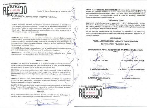 En un documento recibido este 4 de agosto, el Comité Popular por la Revocación de Mandato exponen que dichas propuestas buscan acortar los plazos legalmente establecidos para el ejercicio de este derecho fundamental de participación ciudadana y que vulneran el principio de irretroactividad de las leyes, afectando directamente los derechos políticos de la ciudadanía oaxaqueña.