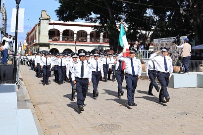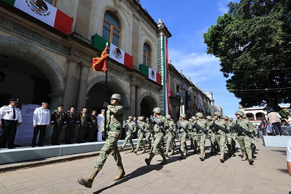 El desfile ingresó al primer cuadro del centro histórico por la calle Valerio Trujano esquina 20 de Noviembre, haciendo una parada cívica en el Zócalo, frente a Palacio de Gobierno, donde se encontraba el templete oficial con autoridades estatales y mandos militares.