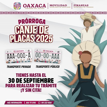 Oaxaca, Oaxaca, Domingo 28 de Septiembre, 2025 (Fuente: Comunicado).- La Secretaría de Movilidad (SEMOVI) recuerda que la prórroga para el canje de placas vehiculares concluye el próximo martes 30 de septiembre, por lo que hace un llamado a las y los oaxaqueños para que realicen su trámite en tiempo y forma.