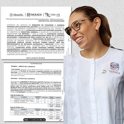 Oaxaca, Oaxaca, Miércoles 01 de Octubre, 2025 (Fuente: Sayda Morales Bustamante / @InquisidorOax).- La austeridad parece ser solo un discurso. Mientras el gobierno estatal insiste en la narrativa de cuidar los recursos, la realidad es otra: el Colegio de Estudios Científicos y Tecnológicos del Estado de Oaxaca (CECYTEO), bajo la dirección de Blanca Luz Martínez Guzmán, firmó un contrato para la compra de chamarras y agendas con el logotipo institucional, cuyo costo total asciende a $112,914.52 pesos.