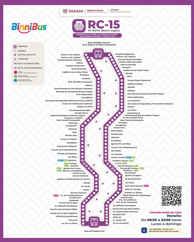 Una de las rutas modificadas es la RC15 Yu ngta’, que significa Barro Negro en Chatino, la cual cuenta con 116 paradas, y conecta el Hospital de la Mujer y la Niñez Oaxaqueña con la Base de Símbolos Patrios.