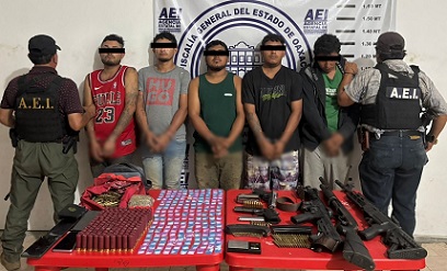 Como resultado del operativo implementado en la comunidad de El Naranjo perteneciente a Mártires de Tacubaya en el distrito de Jamiltepec, se logró la aprehensión de cinco personas, a quienes aseguraron decenas de bolsas empaquetadas con dosis de cristal, marihuana, además de una báscula gramera y diversas armas de fuego.