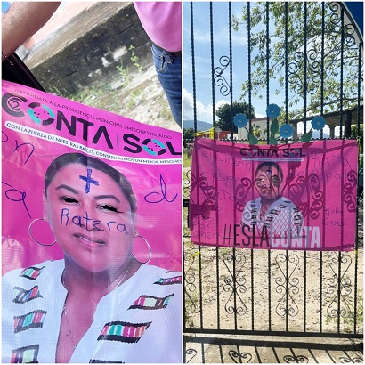 En esta semana aparecieron en la puerta principal del panteón municipal y al interior de este varias lonas de la candidata Marisol con la leyenda “El panteón te espera”, escrito con marcador. El resto de su propaganda en lonas ha sido destruido en su totalidad por personas ajenas contratadas por el candidato de la planilla negra, Marco Antonio Bautista, señalaron.