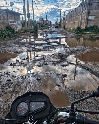 *La carretera hacia las unidades habitacionales Alfareros I, II y III, así como de Lomas y Real Santa María, denominada Camino a Real Santa María, esta totalmente destruida