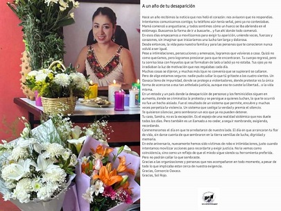 “Muchas cosas se dijeron y muchas más (que no convenía que se supieran) se callaron. Pero de algo estamos seguros: nadie pudo callar lo que tú gritaste a los cuatro vientos. Un Oaxaca lleno de impunidad, donde se protege a violentadores, donde protestar es la única forma de acercarse a esa tan anhelada justicia, aunque eso te cueste la libertad… o la vida misma”.