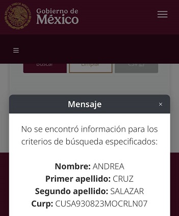 Al buscar por nombre y CURP, el sistema arroja “no se encontraron resultados” cuando no existe constancia de título registrado.