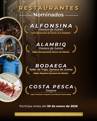Oaxaca, Oaxaca, Martes 13 de enero, 2026, (Fuente: Comunicado).- La Secretaría de Turismo del Estado (SECTUR Oaxaca) informa que dos destinos de la entidad y siete prestadores locales de servicios están nominados en los premios Food and Travel Reader Awards 2025, que reconocen lo mejor del turismo, la hospitalidad y la gastronomía del país.