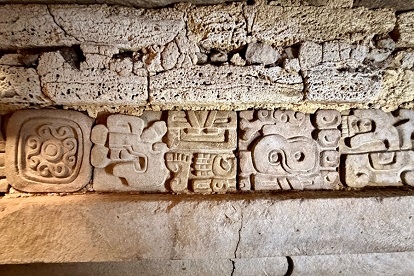En la entrada se aprecia un búho asociado con la noche, poder y muerte; debajo de esta figura hay un hombre zapoteco, a quien posiblemente se dedicó la tumba.