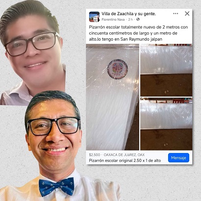 De acuerdo con las publicaciones, el pizarrón —de 2.50 metros por 1 metro— se vende en 2 mil 500 pesos, y la transacción se ubica en San Raymundo Jalpan y la capital del estado. Las imágenes difundidas muestran marcas institucionales, lo que encendió alertas sobre una posible sustracción de bienes del inventario público.