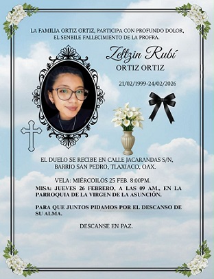 Santa María Lachichina, Villa Alta, Oaxaca, Viernes 27 de Febrero, 2026, (Fuente: Giselle Melchor / Diario El Fortín, Agencia Zona Roja y Agencias).- La comunidad educativa de la región Sierra de Juárez de Oaxaca se encuentra de luto, tras el feminicidio de la maestra Zeltzin Rubí Ortiz Ortiz, originaria de San Pedro, Tlaxiaco (región Mixteca del estado), quien fue localizada sin vida al interior de su domicilio en la comunidad de Santa María Lachichina, perteneciente al municipio de San Juan Yaeé. De acuerdo con las primeras investigaciones, su pareja sentimental, Esau Santiago Lorenzo, la habría privado de la vida y posteriormente se suicidó.