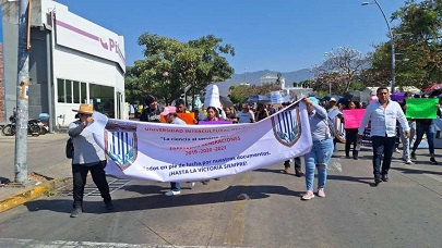 Este viernes, docentes, alumnos y egresados de la Universidad Intercultural del Pueblo de Oaxaca (UIP) marcharon y bloquearon la calzada Porfirio Díaz para exigir al gobierno estatal la entrega de certificados de estudios, transparentar recursos y la contratación del total de la plantilla docente, demandas pendientes desde el 2025.