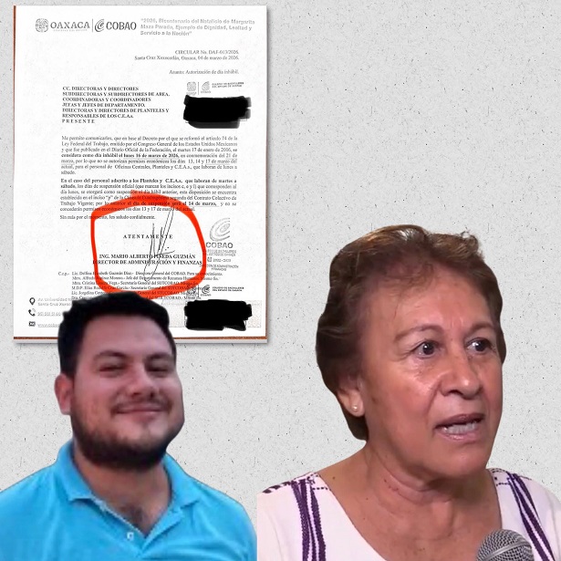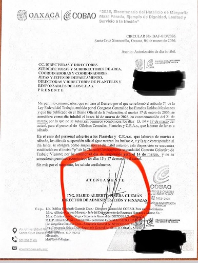Oaxaca, Oaxaca, Martes 17 de Marzo, 2026, (Fuente: Agencias).- Con documentos internos y registros administrativos del propio sistema educativo, tras la llegada de Delfina Guzmán Díaz al frente de la Dirección General del COBAO (Colegio de Bachilleres de Oaxaca), designó como Director de Administración y Finanzas a su sobrino, Mario Alberto Pineda Guzmán, quien actualmente tiene bajo su responsabilidad la operación financiera de uno de los presupuestos educativos más importantes del estado.