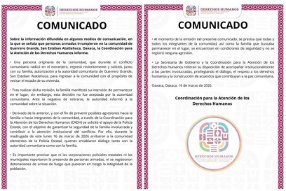 “Por ello, durante la madrugada de este lunes 16 de marzo de 2026 arribaron a la comunidad elementos de la Policía Estatal, quienes entablaron diálogo tanto con la autoridad comunitaria como con la familia”.