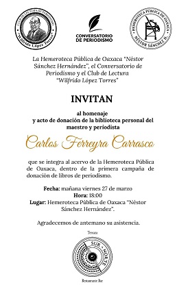 Oaxaca, Oaxaca, Viernes 27 de Marzo, 2026, (Fuente: Comunicado).- Los organizadores de la Primera Campaña de Donación de Libros de Periodismo invitan al homenaje y acto de entrega de la biblioteca personal del periodista Carlos Ferreyra Carrasco, que su familia realizará este viernes 27 a las 18 horas en la Hemeroteca Pública de Oaxaca “Néstor Sánchez Hernández”, ubicada en el Centro Histórico de la capital de Oaxaca.