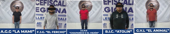 Oaxaca, Oaxaca, Lunes 13 de Abril, 2026, (Fuente: Comunicado).- Resultado de trabajos de inteligencia criminal, la Fiscalía General del Estado de Oaxaca (FGEO) logró la desarticulación de la banda de “La Mami”, dedicada al robo a cuentahabientes con la detención de cinco hombres identificados como B. I. C. alias “El Atolín”, F. J. G. alias “El Fercho”, J. C. H. S. alias “Chiapaneco” o “El Viejón”, G. V. L. alias “El Animal” y A. G. G. alias “La Mami”.