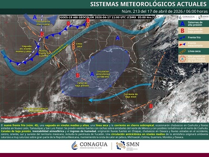 Se mantiene en vigilancia por su posible desplazamiento hacia el sureste del país durante domingo y lunes, aunque de forma debilitada; no obstante, podría ocasionar cambios en las condiciones del tiempo.