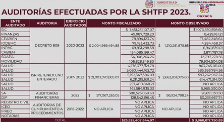 En la conferencia de prensa matutina del gobernador Salomón Jara Cruz, la funcionaria informó que en el ejercicio 2023 la dependencia realizó 20 auditorías sobre el Decreto 809, con un monto fiscalizado de aproximadamente dos mil millones de pesos —de un decreto total de tres mil 500 millones—, dado que la administración anterior ya había auditado alrededor de 900 millones de pesos de ese mismo fondo.