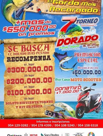 Oaxaca, Oaxaca, Jueves 17 de Enero, 2019 (Fuente: Comunicado).- Se celebrará el 7º Torneo Internacional de Pez Dorado del 18 al 20 de enero del presente año, en uno de los destinos reconocidos en el país y en el mundo como un lugar para disfrutar del sol, el mar y un sinnúmero de riquezas naturales: Puerto Escondido.
