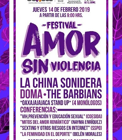 Oaxaca, Oaxaca, Lunes 11 de Febrero, 2019 (Fuente: Comunicado).- El Gobierno del Estado a través de la Secretaría de las Mujeres de Oaxaca (SMO) invita al público en general al “Festival Amor Sin Violencia” que se llevará a cabo el próximo 14 de febrero con motivo de la celebración del “Día del Amor y de la Amistad” en la Ciudad de las Canteras, desde las 9 de la mañana hasta las 9 de la noche.