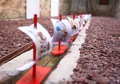 David Moore muestra en los pequeños botes con fragmentos piezas que aluden a códices prehispánicos y libros impresos en Europa.