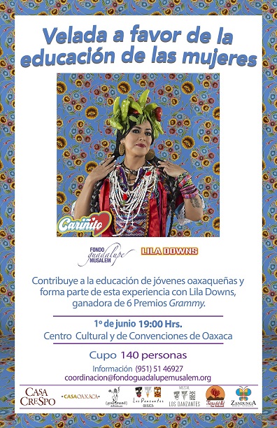 Oaxaca, Oaxaca, Miércoles 08 de Mayo, 2019 (Fuente: Agencias).- En el marco de la campaña de procuración de fondos “Tu donativo cambia su vida 2019”, el Fondo Guadalupe Musalem llevará a cabo una velada que ofrecerá la artista oaxaqueña Lila Downs para apoyar la educación de jóvenes oaxaqueñas.
