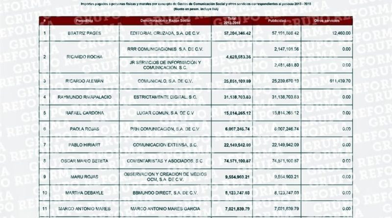 En la lista también aparece Óscar Mario Beteta, con 74 millones 571 mil 100 pesos; Beatriz Pagés, con 57 millones 204 mil 346 pesos; Callo de Hacha, con 47 millones 389 mil 112 pesos; Raymundo Riva Palacio con 31 millones 138 mil 703 pesos. En este caso, el periodista aclaró a REFORMA que se trata de una sociedad de 22 miembros de la que él es representante legal y que de la suma por concepto de publicidad se pagaron impuestos.