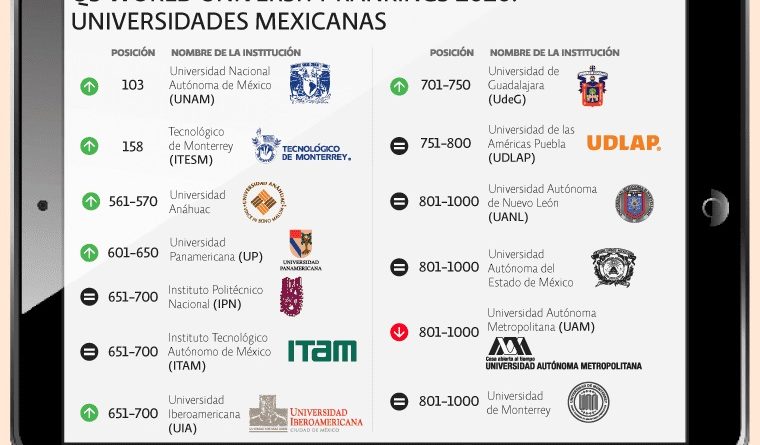 Del total de 88 universidades latinoamericanas que aparecen en el ranking, 13 son mexicanas. Entre ellas, seis escalaron lugares en la tabla general: la UNAM, el Tecnológico de Monterrey, la Universidad Anáhuac, la Universidad Panamericana, la Universidad Iberoamericana y la Universidad de Guadalajara.