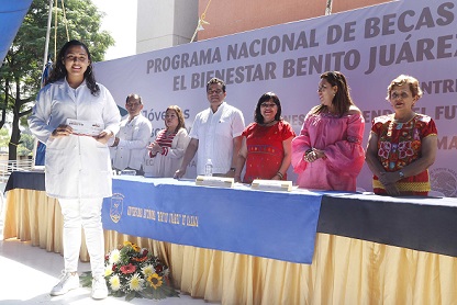 Ante la licenciada Leticia Ánimas Vargas, Coordinadora Nacional de Becas para el Bienestar “Benito Juárez” y de la licenciada Nancy Ortiz Cabrera, delegada federal de los Programas para el Desarrollo de Oaxaca, así como de la licenciada María de Jesús Melgar Vásquez, representante de la Coordinación Nacional de Becas para el Bienestar Benito Juárez en Oaxaca, el rector agradeció el apoyo la comunidad beneficiada.