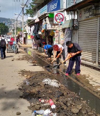 Hombres y mujeres dedicados al trabajo duro en la Central de Abasto, se unieron para limpiar y darle salida a las estancadas aguas negras en las cunetas y hoyancos en la Avenida Central.
