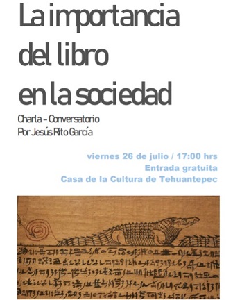 De igual manera, el viernes 26 a las cinco de la tarde, impartirá una Charla – Conversatorio llamada: La importancia del libro en la sociedad. Dicha charla se enfoca en mostrar las ventajas y desventajas del mundo de los lectores, el gremio editorial, la historia del objeto llamado libro, los libros digitales y el futuro de las bibliotecas y librerías. Así como recomendaciones para iniciar con el gusto por leer a cualquier edad. La entrada es gratuita y se llevará a cabo en las mismas instalaciones de la Casa de la Cultura.