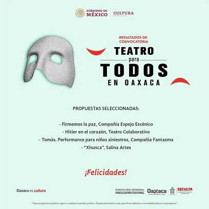 Tal como se había anunciado a principios del mes de agosto; la SECULTA lanzó la convocatoria “Teatro para todos” en Oaxaca, la cual cerró el pasado 13 de septiembre, con la integración de 12 proyectos, donde el jurado calificador compuesto por Laura Isadora Oseguera Pizaña, Verónica Musalem Moreno y Zheyra Sofía Vera Castillo realizaron una minuciosa revisión, seleccionando únicamente cuatro propuestas.