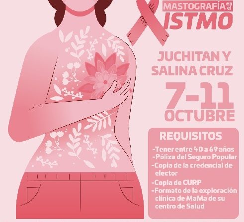 Las jornadas se realizan en el marco del Día Mundial de la Lucha contra el Cáncer de Mama que se conmemora cada 19 de octubre, en coordinación con los Ayuntamientos Municipales de Salina Cruz y Juchitán de Zaragoza.